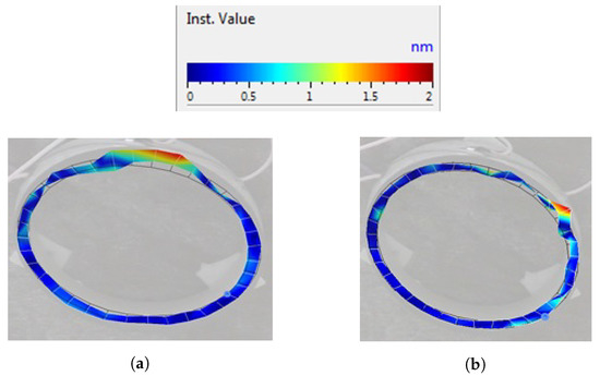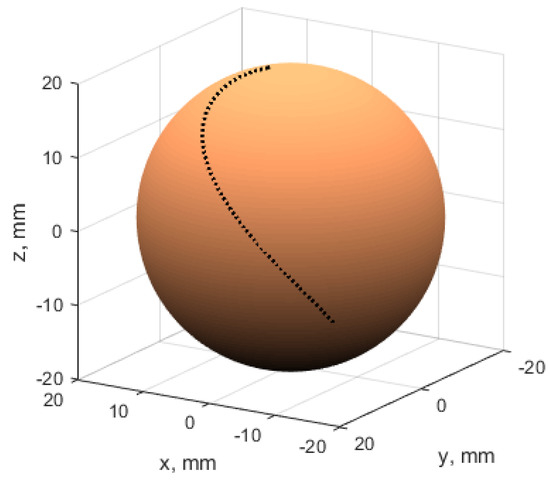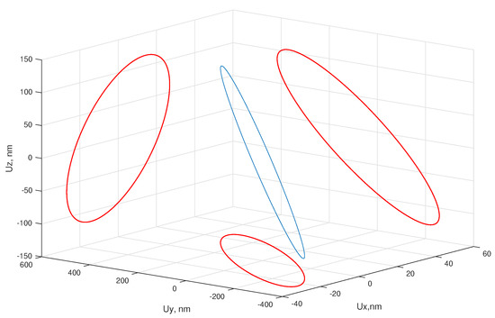 The proposed electrode configuration and the excitation of two electrodes with different voltages result in rotation of the sphere by two contact points. The contact point trajectory was calculated. The analysis shows that the contact point between electrodes 4 and 5 on XZ plane (Figure 1b) moves in ellipsis that has angle (angle describes rotation of ellipse on the plane). The contact points that are positioned in the middle of electrodes 4 and 5 produce elliptical motion as well, but the angles are and respectively. The movement of the second contact point (Figure 4b—node 10) is shown in Figure 7. The direction and angles of the contact points can be effectively controlled by changing the applied voltage. When electrodes 6, 7 or 8 are excited, the biggest deformations occur in the bottom nodes. These are used to move the actuator on the plane. Exciting the top and bottom electrodes at the same time results in both rotations of the sphere and movement of the actuator.