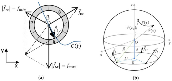 The electrode segment that is the nearest to the total force vector must be selected for excitation and its numeric value must be equal to maximum (Figure 8a). To obtain precision of the motion, a force that is cardinally in the opposite orientation than the total force must be activated. Its value must be equal to the minimum value of the force . The value of the third electrode is calculated after solving a system of equations [14]: