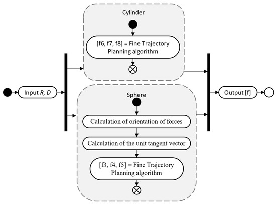 Different electrode switching and trajectory planning algorithms of the cylinder movement on the plane and sphere rotation are developed [16,17]. However, there is no research performed and trajectory planning algorithm developed, when two active kinematic pairs are used. Therefore, a new algorithm must be created. Based on the previous investigation of trajectory planning algorithms, it can be concluded that only a fine trajectory planning algorithm is suitable for this task [14,15]. The fine trajectory planning algorithm allows exciting two or more electrodes of the cylinder at the same time for obtaining a linear motion of the cylinder or rotation of the sphere. This method has the advantage of achieving the maximum available speed of movement, when certain contact forces are used. Therefore, the main task of the trajectory planning algorithm is to calculate the function of the contacting forces that can be obtained by exciting a particular electrode section of the piezoelectric cylinder.