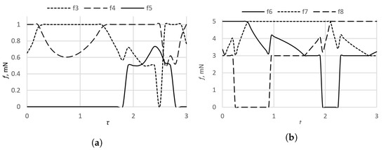 The trajetory of the cylinder is given in Figure 11. The forces of the sphere must be in the interval mN, and the forces of the cylinder in the interval mN. The results of the calculation of the cylinder forces and the sphere electrode segments are presented in Figure 12a,b.