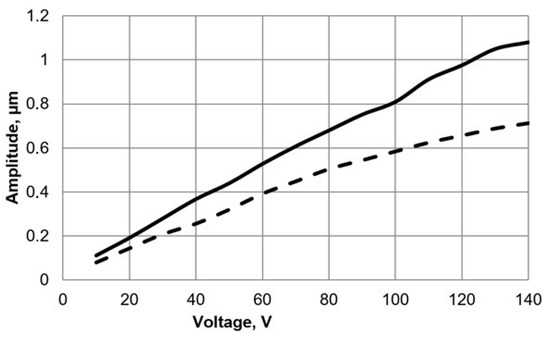 Amplitude vs applied voltage of the axial vibrations of contacting element at the operational frequency 93.6 kHz: dashed line—when the triangle-shaped electrode tip is directed to an active contacting element; solid line—when the triangle-shaped electrode tip is directed backwards to the active contacting element.