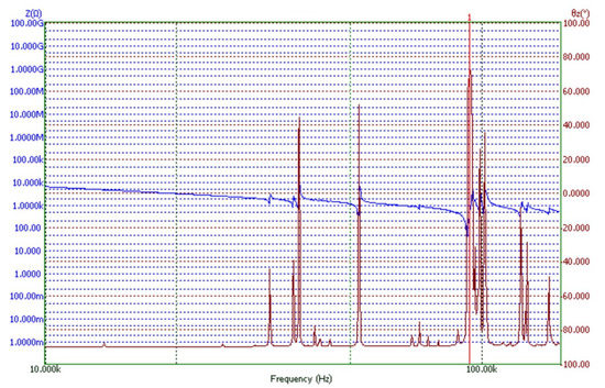 Impedance/phase diagrams of the piezoelectric cylinder. A resonant frequency for driving a transducer is 93.6 kHz.