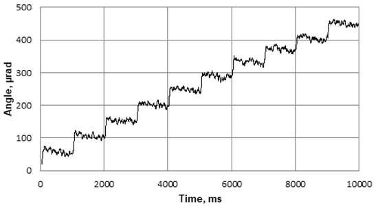 The vibrations of a cylinder-shaped transducer visualized with 3-D laser scanning vibrometer at a driving frequency of 93.6 kHz are shown in Figure 14. It can be noticed that the area of the deflections of the top surface is about 2 times larger, when driving voltage is connected to the triangle-shaped electrode with the tip directed backwards to the scanned surface. It confirms that the position of the 3 points of contact on the end surfaces of each side of the piezo cylinder should be by the middle of the side of the triangular electrode as shown in Figure 4b. Figure 15 shows dependence of the amplitude of the axial point of the contact point versus applied voltage. The dashed line shows the case when the triangle-shaped electrode with the tip directed to the active contacting element is excited; while solid line represents the case when the triangle-shaped electrode with the tip directed backwards to the active contacting element is excited. It can be noticed that almost linear dependence was obtained. Moreover, it can be seen that the vibration amplitude depends on electrode configuration, and larger amplitude value is obtained when the triangle-shaped electrode with the tip directed backwards to the active contacting element is excited. The results of the experiment show that three-dimensional resonant vibrations of contact points of the piezo cylinder are excited at a driving frequency of 93.6 kHz (Figure 16). These vibrations generate the lateral motion of the piezo cylinder placed on the horizontal plane, or the angular rotation of the sphere placed on 3 contact points of the piezo cylinder. The results of the rotation angle measurement about x axis of the sphere are shown in Figure 17. One electrode of the piezoelectric actuator was excited with the harmonic electric signal containing 10 periods. The excitation frequency was 93.6 kHz, while voltage amplitude was 40 V. Such electric signal was applied in steps every second. A minimal resolution of 50 rad was obtained, whereas average rotation speed was 42.5 rad/s. Compared to the results of FEM analysis, the difference of driving frequency differed only by 5.5% (88,361 Hz compared to 93,600 Hz). The direction of the lateral motion of the cylinder and the direction of the angular rotation of the sphere can be controlled by the algorithm presented in Section 3. A working prototype is shown in a Supplementary Video.