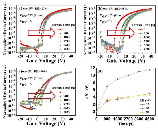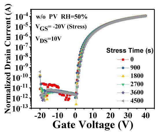 In addition, we measured the negative gate bias-stress (NGBS) instability of a-IGZO TFTs at RH = 50%, as shown in Figure 3. During the NGBS tests, a direct voltage of −20 V was applied to the gate electrodes for a period and then the transfer curves were instantly measured. After 4500 s of NGBS test, nearly no Vth shift was observed. When a negative voltage was applied to the gate electrode of a-IGZO TFTs, the oxygen atoms in a-IGZO tended to be repelled into the ambience, leading to negative shifts of Vth [25]. However, this process might have been effectively prohibited by the moisture-assisted oxygen adsorption [11,12,22], especially when the ambient RH was high. Therefore, no evident Vth shifts were exhibited during the NGBS tests in this study.