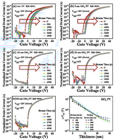 Figure 4. Stress-time dependence of the transfer characteristics of the a-IGZO TFTs with a SiO2 PV layer thickness of (a) 0 nm, (b) 5 nm, (c) 10 nm, (d) 20 nm, and (e) 30 nm, respectively; (f) experimental data and fitting curves of the ΔVth under PGBS as a function of PV layer thickness of the a-IGZO TFTs.
