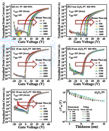 For comparison purposes, we also measured the PGBS stability of the a-IGZO TFTs passivated by Al2O3 PV layers with a thickness of 0 nm, 5 nm, 10 nm, 20 nm, and 30 nm, respectively, as shown in Figure 5a–e. We may observe that a fairly similar tendency to the case of SiO2-passivated devices was obtained here, i.e., the a-IGZO TFTs under PGBS became increasingly stable with the increase in the Al2O3 PV layer thickness. Meanwhile, for both Al2O3 and SiO2 PVs, the transfer curve positively shifted as the PV layer thickness increased, which can be attributed to the extra interface states generated during the PV depositions [26,27]. However, the Al2O3 PV layer also exhibited something different. As shown in Figure 5e, for the device with a thick PV layer (≥20 nm), its leakage current gradually rose with the increase in the stress time. This phenomenon was probably due to the plasma bombardment on the surface. Since the deposition rate of Al2O3 (0.7 nm/min) was smaller than that of SiO2 (1.5 nm/min), more sputtering time was needed for the deposition of the Al2O3 PV layers, leading to more serious plasma damage at the back channels. What is more, the ion bombardment of the plasma can result in a positive Vth shift [17,18], which explains why the leakage current of the devices with thick Al2O3 PV layers increased during the PGBS tests.