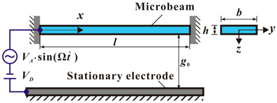 A microbeam-based resonator in Figure 1 is actuated by an electric load , where is the time, is the DC voltage, and and are the amplitude and frequency of the AC voltage. , , and are the length, width, and thickness of the microbeam, respectively. is the initial gap width between the microbeam and the stationary electrode. This microbeam is doubly clamped which can induce midplane stretching during static deformation or dynamic vibration.
