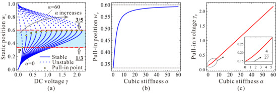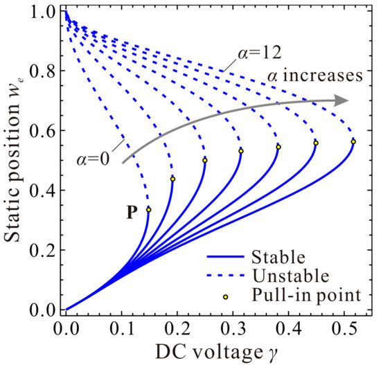 It is obvious from Equations (13) and (16) that the static pull-in position and pull-in voltage are determined only by cubic stiffness . Figure 2 depicts a general understanding of the evolution of the static position versus DC voltage for different cubic stiffness . With the increase of , the static pull-in position corresponding to the static pull-in point P increases rapidly at first and then closes to a upper limitation, while the static pull-in voltage keeps growing and seems to have no upper limitation. To explore the phenomena in detail, derivation and proof are done in the following study.