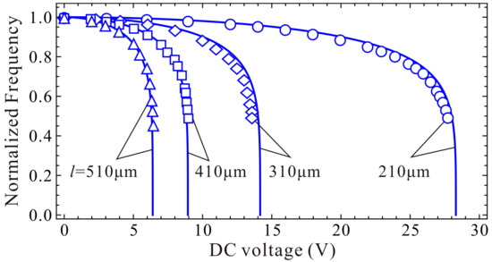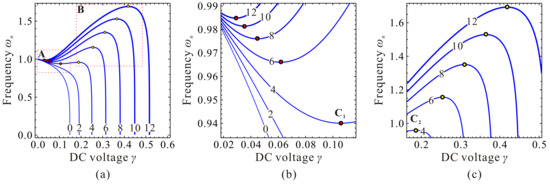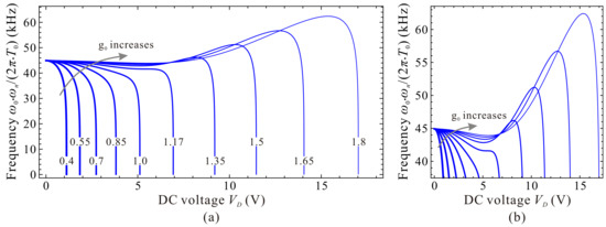 For a specific microresonator, cubic stiffness is a specific value. Only DC voltage can tune the fundamental frequency . Thus, the derivative of to can be deduced to discuss the variation properties of versus . At extreme point C1 and C2, based on Equations (11) and (19), the derivative of to satisfies