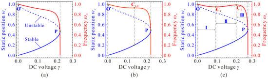 It can also be observed from Figure 5c that C1 and C2, combined with start point O and pull-in point P, can separate the static position curve and the fundamental frequency curve into three regions, Region-I, Region-II, and Region-III. In Region-I, with the increase of DC voltage , the fundamental frequency decreases slightly. In Region-II, monotonously increases with the increase of . In Region-III, with the increase of , decreases until static pull-in instability occurs. Different from fundamental frequency , static position always increases with the increase of .