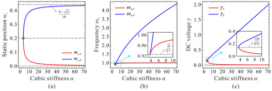 Evolutions of the static position, fundamental frequency, and DC voltage of point C1 and C2 versus cubic stiffness can be observed in Figure 6. From this figure, one can notice that our predictions in Table 2 coincide with numerical results, which verifies the correctness of our theoretical analysis.