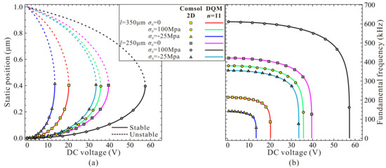 In this section, high-order DQM [22] using certain number of grid points on microbeam is applied to simulate Equation (5) while COMSOL 2D model [16,37] is also used to simulate the static position and the fundamental frequency of a specific MEMS resonator. Nondimensional results obtained via 1-DOF model Equation (10) are applied for theoretical guidance.