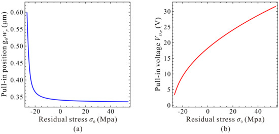 Qualitative property of the static pull-in position (a) and pull-in voltage (b) versus residual stress.
