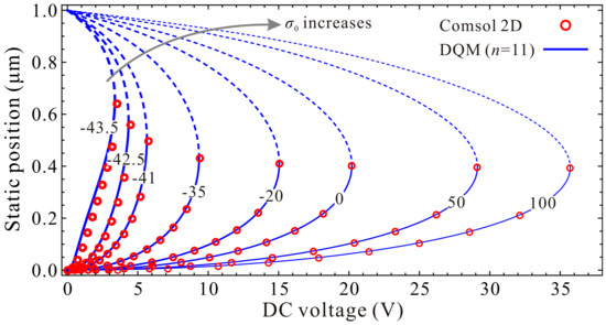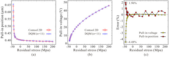 Next, guided by the qualitative results, we use high-order DQM model with 11 grid points to investigate the residue stress effects on the static pull-in position and pull-in voltage. Similarly, we start our numerical simulation with the residue stress . Figure 11 shows the DQM results depicting the static position versus DC voltage with the increase of residue stress, in which COMSOL 2D results are provided to illustrate the correctness of numerical simulations. Figure 12 exhibits the detailed variations of the static pull-in position and pull-in voltage versus the residue stress. Relative errors calculated according to (DQM results–COMSOL results)/(COMSOL results) × 100% are also shown in Figure 12c. It is obvious from this figure that the DQM results agree well with COMSOL 2D results except some values when is close to buckling residue stress. Perhaps the reason is that numerical solutions are more sensitive to DC voltage when buckling instability is about to be triggered. Note that for this microresonator, the maximum static pull-in position is approximately 0.65 μm, and minimum pull-in position is approximately 0.39 μm, while the minimum static pull-in voltage is approximate to 3.37 V, and it seems to have no maximum pull-in voltage. Here, we are more concerned with the curve tendencies between 1-DOF model and the continuous model. Through comparison of Figure 9 and Figure 11, we find that this generalized 1-DOF model can totally reflect the influences of residue stress on the static pull-in properties. Curve tendencies in Figure 10 and Figure 12 also show excellent agreement with each other.