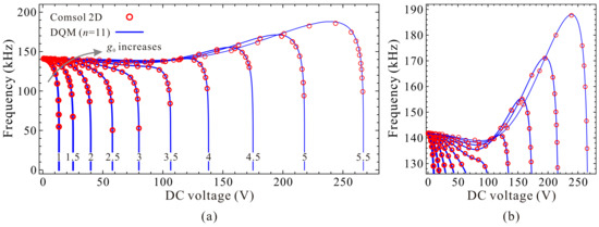 To discuss the dimensional fundamental frequency, the beam length l is set to be 350 μm and the residue stress . Only the effect of initial gap width is considered. Figure 13 exhibits the qualitative property of the fundamental frequency versus DC voltage for different initial gap width . An interesting phenomenon is observed that the extreme point C1 and C2 cannot hold the same variation properties as the nondimensional diagram in Figure 4. That is because the initial gap width can influence both the nondimensional cubic stiffness and the DC voltage . An increase of can increases , while decreases , inducing such differences between dimensional diagrams and nondimensional ones. Quantitative results via DQM and COMSOL 2D model can also be observed in Figure 14. Compared with Figure 13 and Figure 14, one can notice that the curves show a consistent trend with each other as well. These demonstrate that dimensional analysis via the 1-DOF model can be used for qualitative identification of the fundamental frequency of the system.