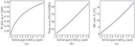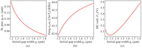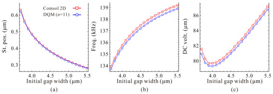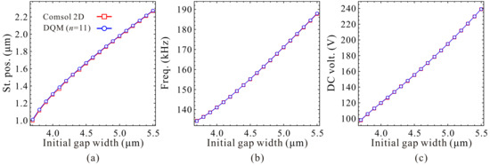 Next, the static positions, fundamental frequencies and DC voltages corresponding to the extreme point C1 and C2 are discussed in detail. Qualitative results via the 1-DOF model are shown in Figure 15 and Figure 16. We can observe that the static positions in Figure 15a and Figure 16a, the fundamental frequencies in Figure 15b show similar trends compared with Figure 6a,b, respectively. However, the fundamental frequencies in Figure 16b, the DC voltages in Figure 15c and Figure 16c have some differences compared with nondimensional diagrams in Figure 6b,c, respectively. The reason is that the initial gap width can affect the cubic stiffness and the DC voltage both. These also imply that nondimensional diagrams may ignore some nondimensional parameter coupling effects on the system statics and dynamics. Figure 17 and Figure 18 show the quantitative properties of the above three physical parameters corresponding to extreme point C1 and C2. From the results, one can notice that all the variation properties have similar trends as those in Figure 15 and Figure 16. The errors between DQM and COMSOL 2D model seem to be acceptable, which verifies the correctness of our analytical and numerical results.
