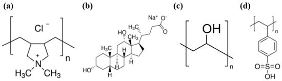 Purified electric arc single-walled carbon nanotubes (SWNTs, TUBALL™ SWNT, individual tube: average 1 μm length and 2 nm diameter, carbon content 75%) and graphene nanoplatelets (GNPs, Angstron, maximum X–Y dimensions of 10 μm, carbon content 95%, oxygen content ≤ 2.5%) were used in this study. PDDA (Mw~200,000–350,000 g/mol, Figure 1a), sodium deoxycholate (DOC, C24H39NaO4, Figure 1b), PVA (Mw~89,000–98,000 g/mol, Figure 1c), poly(4-styrenesulfonic acid) (PSS, Mw~75,000 g/mol, 18 wt% in H2O, Figure 1d), isopropyl alcohol (IPA), and methanol were purchased from Sigma-Aldrich (Yongin, Korea). All chemicals were used as received. A PET film (100 μm thickness, Goodfellow, Huntingdon, England, UK) and single-side-polished silicon wafers (University Wafer, Boston, MA, USA) were purchased as substrates.