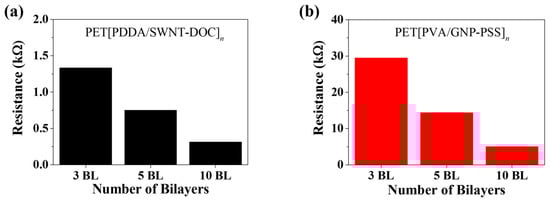 Figure 4a,b show the light absorbance of PET[PDDA/SWNT-DOC] and PET[PVA/GNP-PSS] with an increasing number of BLs. As shown in Figure 4c, the light absorbance increases uniformly from 1 to 10 BLs in both thin films. This indicates that SWNT and GNP layers are linearly deposited during LbL coating. In addition, it can be confirmed that SWNT bilayers exhibit a relatively much lower absorbance than GNP because SWNT is a 1-D material with an exceptionally small diameter and GNP is a relatively larger 2-D platelet. Based on its characteristics, SWNT is widely used as a transparent electrode in several studies [30,31,32]. Figure 4c,d show the absorbance and transmittance at 550 nm in the two LbL systems. As can be observed from Figure 4c, the absorbance linearly increases to 0.16 for PET[PDA/SWNT-DOC]10 and to 0.9 for PET[PVA/GNP-PSS]10. Conversely, the light transmittance decreases to 69% for PET[PDA/SWNT-DOC]10 and 11.6% for PET[PVA/GNP-PSS]10. This can be observed more clearly in Figure 4e, which shows 3, 5, and 10 BL PET[PDA/SWNT-DOC] and PET[PVA/GNP-PSS] samples with a bare PET (0 BL), respectively. Both carbonaceous nanomaterials (i.e., SWNT and GNP) demonstrate that as the number of BLs increases, the color of the LbL thin films gradually darkens; in particular, the GNP LbL thin film is distinctly darker.