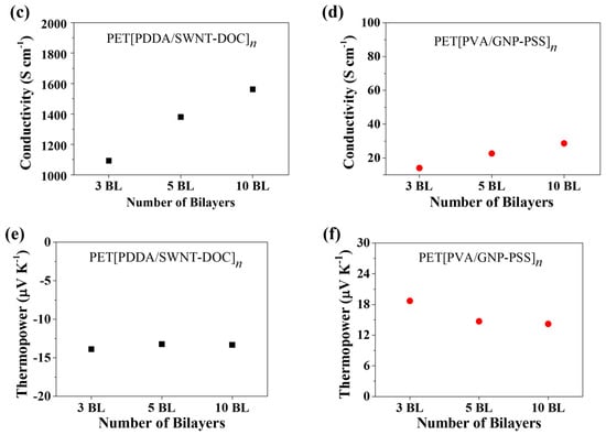 (a,b) Electrical resistance of PET[PDDA/SWNT-DOC]n (n = 3, 5, 10) and PET[PVA/GNP-PSS]n (n = 3, 5, 10) LbL thin films. (c,d) Electrical conductivity of PET[PDDA/SWNT-DOC]n (n = 3, 5, 10) and PET[PVA/GNP-PSS]n (n = 3, 5, 10) LbL thin films. (e,f) Thermopower (Seebeck coefficient) of PET[PDDA/SWNT-DOC]n (n = 3, 5, 10) and PET[PVA/GNP-PSS]n (n = 3, 5, 10) LbL thin films.