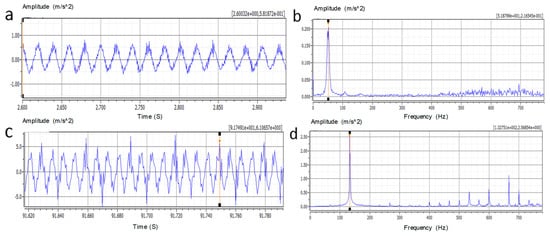 Figure 1. (a,b) The vibration signal in Z direction on the cylinder head of the 2HO engine at 800 r/min in time and frequency domain; (c,d) The vibration signal in Z direction on the cylinder head of the 2HO engine at 4000 r/min in time and frequency domain.