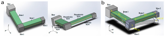 Considering the 80 Hz frequency range of the monitored engine vibration environment, this paper combined the L-shape beam-mass structure and the piezoelectric bimorph cantilever beam structure to form the wideband piezoelectric energy harvester configuration, as shown in Figure 3a. By the advantage of tuning to the first two natural frequencies relatively close to each other, the L-shape beam-mass structure can be used as a wideband energy harvester.
