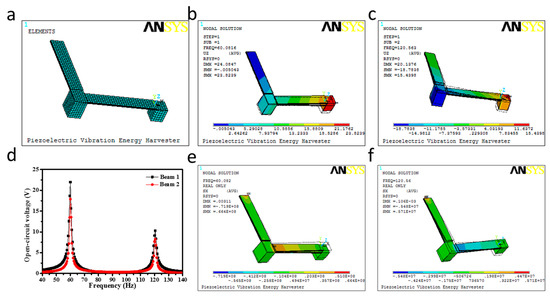 Figure 4. (a) Finite element models of the wideband piezoelectric vibration energy harvester in ANSYS; (b,c) The first two vibration modal analysis of the wideband piezoelectric vibration energy harvester; (d) The dynamic frequency vs. the open-circuit voltage; (e,f) The stress nephograms along the length of the beams of the wideband piezoelectric vibration energy harvester.