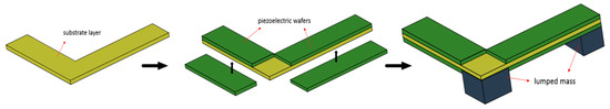 As mentioned above, PZT-5H is used for piezoelectric ceramic plates, and phosphor bronze is used for cantilever beam and lumped mass. The fabrication process of the harvester is shown in Figure 6. First, the surface of the cantilever beam and the mass is sanded with sandpaper to provide a certain roughness for easy bonding. Then the piezoelectric ceramic plates, the cantilever beam and the mass were sequentially washed with acetone solution and ethanol solution to remove dust, oil, and oxides on their surface. Next, stick the piezoelectric ceramic plates to the surface of the cantilever beam by using epoxy based electric conduction silver gum as adhesive. They were placed in a vacuum drying oven and heated at a temperature of 60 °C for about 2 h to completely cure the electric conduction silver gum. Finally to ensure insulation between the mass and the cantilever beam, the two lumped masses were adhered to the end of cantilever beam with AB adhesive and stand for 10 min until it is completely solidified.