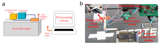 The schematic diagram of the test platform construction is shown in Figure 8a, mainly including: (a) an automobile engine; (b) a piezoelectric energy harvester; (c) a power management circuit; (d) an accelerometer; (e) a wireless transmission module. The subject of this experiment is the Chevrolet Epica 2HO automotive engine. The accelerometer selected for this test is a 3-axis, MEMS accelerometer ADXL343 (Analog Devices, Inc., Norwood, MA, USA) with digital output of 13 bits and its measurement range is ±16 g. Figure 8b is the picture of experimental test system.