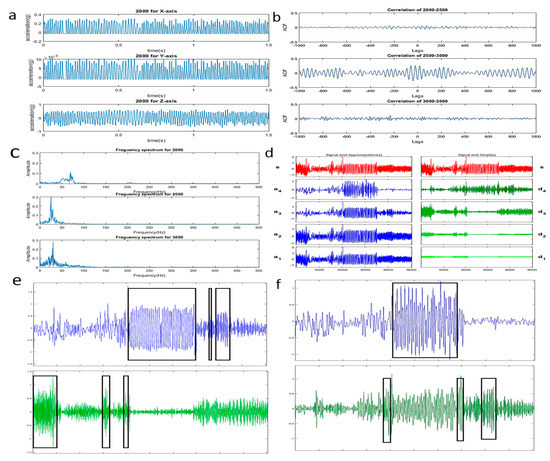 Figure 9. (a) The initial vibration signal of 2000 r/min, 2500 r/min, and 3000 r/min; (b) cross correlation analysis of the three sets of signals; (c) spectrum of the three sets of signals; (d) four level wavelet decomposition of the vibration signals; (e) the third level wavelet decomposition, upper (0 Hz–62.5 Hz), lower (62.5 Hz–125 Hz); (f) the forth level wavelet decomposition, upper (0 Hz–31.25 Hz), lower (31.25 Hz–62.5 Hz).
