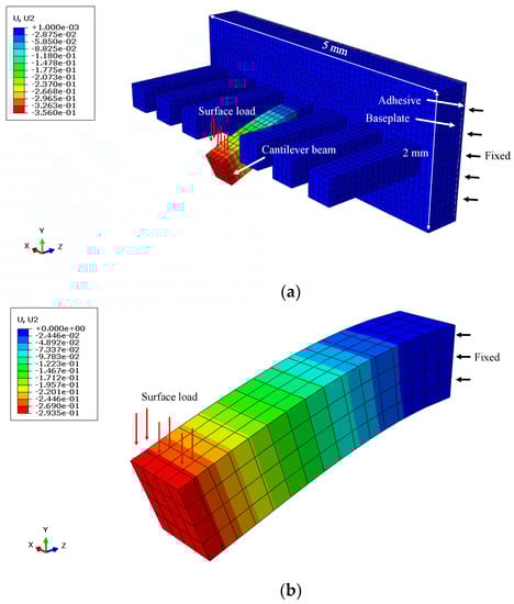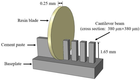 where L is the effective length of the cantilever beam; k is the beam stiffness, which is defined as the slope in the linear region of the load-displacement curve; and ν and κ are the Poisson’s ratio of the cement paste and shear coefficient for rectangular cross-section, respectively. Considering the values reported in the literature [,,,,], ν = 0.25 and κ = 5/6 are used in this study. In addition, it should be borne in mind that the measured load-displacement curves also include the influence of the baseplate and adhesive, which may potentially underestimate the stiffness of the beam []. To evaluate the effects of the baseplate and adhesive on the overall stiffness, a finite element model using commercial software, ABAQUS, was established. The model consists of approximately 9000, three dimensional, eight-node brick elements (C3D8R), with a geometry as shown in Figure 3. In this model, the thickness of the adhesive was assumed to be 50 μm, and the elastic moduli of the cement paste and adhesive were set to 15 GPa and 3 GPa, respectively. The thickness of the baseplate used in the model varied from 100 μm to 500 μm. Meanwhile, a single cantilever beam with a fixed end was also simulated for comparison. An example of the numerical model, including the mesh and boundary conditions, is illustrated in Figure 7. The simulation results reveal that the additional deflection caused by the adhesive is not more than 0.5–0.6% of the total beam deflection, which is thought to be negligible. However, the extra deflection caused by the baseplate accounts for around 5–20% of the total beam deflection, largely depending on the thickness of baseplate. For the sake of simplicity, in this study, the extra deflections caused by the adhesive and baseplate are not taken into account in the estimate of the elastic modulus. Nevertheless, continuous improvement of the test procedure is required to further minimize the discrepancies in measured material properties, which is not attributed to the materials themselves.