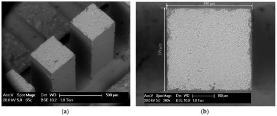 For the fabrication process of miniaturized cantilever beams, several steps were followed: Firstly, the two ends of slices were further ground using a Struers Labopol-5 thin sectioning machine. To obtain smooth and parallel surfaces, grinding discs with two different grit sizes of 135 μm and 35 µm were used in sequence. The final thickness of the sample was approximately 2.15 mm; the next step is to generate the miniaturized cantilever beams from the thin samples. This is achieved by utilizing a precision micro-dicing machine (MicroAce Series 3 Dicing Saw, Loadpoint Limited, Swindon, UK), which is mainly applied to cut semiconductor wafers. By applying two perpendicular cutting directions and same cutting space, a row of cantilever beams, including at least 20–30 beams, with a square cross section of 380 µm × 380 μm were obtained. The cantilevered length was approximately 1.65 mm and the thickness of the baseplate was less than 500 µm. The cutting process is schematically shown in Figure 1. Afterwards, the cross-section of the beams was examined by using an environmental scanning electron microscope (ESEM). The fabrication process yields an overall accuracy for the cross-sectional dimensions of ±5 μm (Figure 2b).