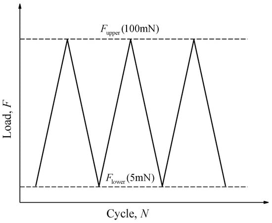 Fatigue tests were performed using the same experimental apparatus (Agilent G200 nanoindenter) as static tests. In total, nine cantilever beams with a w/c ratio of 0.5 were tested under the same upper and lower load. The tests were load-controlled with a constant upper load of 100 mN. The ratio, R, between the minimal and maximum load was 0.05. Figure 4 illustrates a schematic diagram of the load-cycle curve used in the fatigue tests. The tests were carried out using the constant amplitude triangular load with a frequency of 0.33 Hz. Note that due to the material heterogeneity, the realistic stress level (tensile stress divided by the static strength) for each specimen is varied even under the same maximum load. For the sake of simplicity, the average value of 63% is adopted to describe the applied stress level. Due to the limitation of test duration in the nanoindenter, four identical load blocks with 250 loading cycles (in total 1000 cycles) were performed on each beam and all of them were conducted in succession without any rest period. Since the fatigue load must be unloaded to zero after completing each load block, the residual displacement was recorded to connect with the succeeding block. Besides, before the end of each load block, the indenter was held for around 50 s at a lower load for the purpose of thermal drift correction []. After reaching the target number of cycles, the beams were statically loaded until failure. The load-displacement curves for fatigue tests as well as static tests were recorded by the nanoindenter.