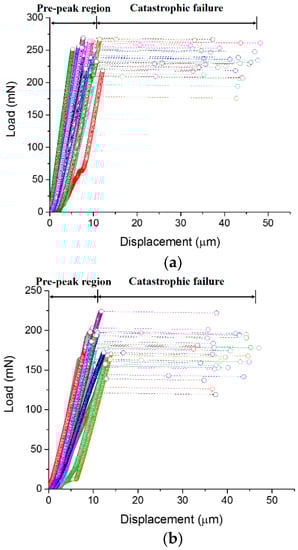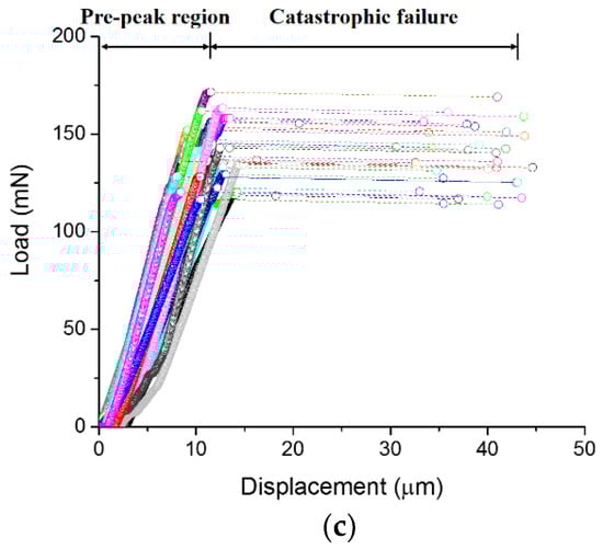 The load-displacement curves for different w/c ratios are presented in Figure 5. A high degree of repeatability is found for measurements on 30 cantilever beams with the same w/c ratio. It can be seen that the load-displacement curves show two distinct stages. In the first stage, the displacement increases linearly with the increase of load until the maximum load is reached. It is then followed by a rapid burst of displacement in the second stage, where a nearly brittle fracture occurred. Since the displacement control of the nanoindenter is not fast enough to capture the post-peak behaviour of the specimen, it results in an overshoot of the indention tip, thus presenting a horizontal line in the load-displacement curve [].