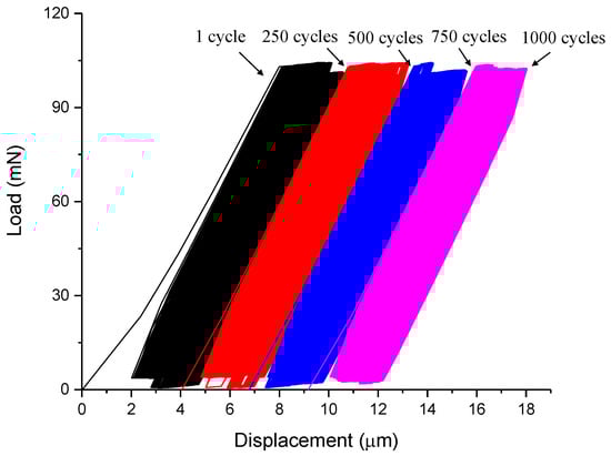 The typical measured load-displacement curve of the fatigue test is shown in Figure 8. The figure shows that the load-displacement relation for each cycle is approximately linear, and also the residual displacement are accumulated with the increase of loading cycles. The variation of stiffness during loading characterized by the slope of the loading curve for all fatigue tests are plotted in Figure 9, together with the line of best fit. It is found that the loading stiffness changes very little with the number of cycles, which is associated with a slow accumulation of damage during the fatigue loading. It should be noted that the fatigue response of material is very sensitive to the flaws and defects [,,]. Consequently, when compared with the mortar or concrete at the larger scale, the cement paste at the micro scale exhibits higher fatigue resistance due to less initial defects, such as the porous interfacial transition zone (ITZ) [].