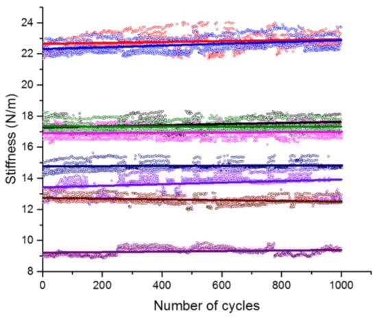 The loading stiffness versus the number of cycles for all fatigue tests (different colors represent different specimens).