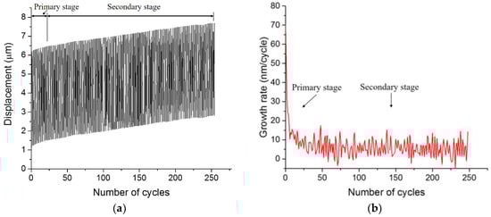 A typical curve of (a) displacement versus the number of cycles; (b) growth rate of displacement with cycles.