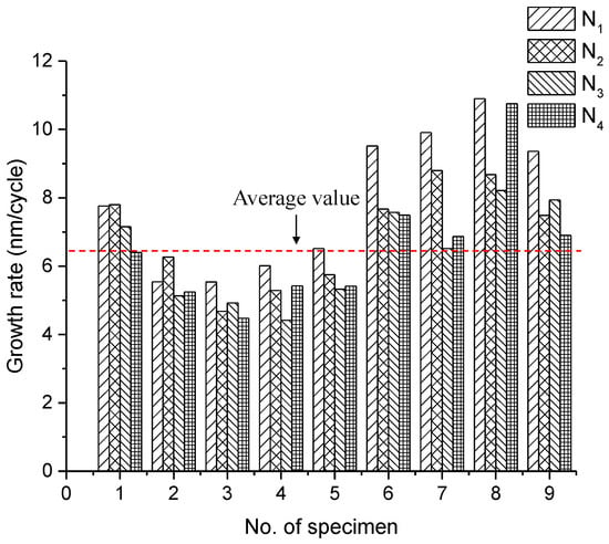 As an important indicator of the fatigue damage, the residual displacements at a lower load are extracted from the load-displacement curve. A typical curve for the development of residual displacement under four identical loading blocks is plotted in Figure 11. Despite the discontinuity between each load block, the development of residual displacement shows an overall increasing trend with nearly the same slope. This indicates a stable propagation of microcracks in cantilever beams even with the interruption of cyclic loading. Figure 12 presents the constant growth rate of the residual displacement for each load block as well as the average value of all tests (6.47 ± 1.01 nm/cycle). Note that the data with large deviations are excluded in the calculation of the average value. Figure 12 indicates that the growth rate of each load block shows a high degree of consistency. Nevertheless, the value between each specimen is relatively scattered, mainly due to the natural heterogeneity of cementitious materials.