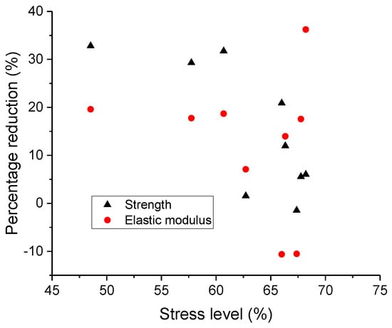 To quantitatively assess the degree of fatigue damage, all damaged cantilever beams were loaded statically to failure. The percentage reduction of the strength and elastic modulus for each beam were plotted against the stress level in Figure 13. The obtained average percentage reduction of the strength and elastic modulus are 15.29% and 15.78%, respectively.