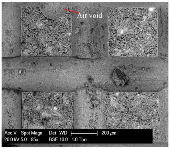 As expected, a large scatter can be observed in this diagram. For instance, the percentage reduction of strength ranges from 1% to 20% even under the same stress level of 67%, while the percentage reduction of the elastic modulus lies in a wider range of −10% to 36%. A downtrend inferred from Figure 13 indicates that the higher stress level leads to the lower percentage reduction of mechanical properties, which seems to be unrealistic. On the other hand, since the number of tests is relatively small, it is not enough to make a rational judgement of the results. Nevertheless, the observed scatter in Figure 13 implies that the applied stress level may not be a proper parameter to correlate the residual mechanical properties at this length scale. The cause of the failed interpretation of the results is mainly attributed to the assumption of a constant strength. However, cement paste at the micro scale contains different size of pores and initial defects [,,]. Most of them are formed during the hydration process [] or induced by the external factors, such as casting and vibration. For instance, a large air void can be detected in the cross-section of the cantilever beam, as shown in Figure 14. Therefore, the randomly distributed pores may result in the difference of original strength. This is consistent with previous numerical work [], in which the predicted mechanical properties of cement paste at the microscale were largely influenced by the real microstructures.