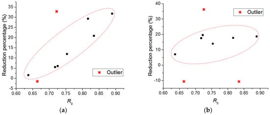 The relation between the percentage reductions of (a) strength; (b) elastic modulus against the ratio, R0.