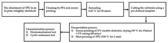 A screen-printing method was used to fabricate the conductive track and dielectric overlayer. The screen used in this work was fabricated by Finnseri Oy (Hyvinkää, Finland). The screen contains polymer mesh with a 79 threads/cm mesh count, 69 µm mesh opening, and 55 µm thread diameter. Before the printing process, the TPU substrates are slightly (approximately 3%–5%) stretched, and attached to aluminum plates. The aluminum plate supports the sheet to prevent folding during the printing process. Semi-automatic printing equipment (TIC, SCF-300, Siebdruck-Service Eickmeyer GmbH, Bünde, Germany) was used for the printing process. For the fabrication of conductive tracks, two consecutive printing cycles were performed. The conductors were heat-annealed in oven for 30 min at 125 °C. The printing quality was inspected by using an optical microscopy. Two different encapsulation methods were investigated: (1) UV-curable dielectric ink and (2) heat-laminated TPU. A screen-printable dielectric, as the encapsulation layer, was printed on interconnects after properly aligning the substrate under the screen. Samples were initially dried in an oven for 15 min at 50 °C. Then, the UV radiation provided by Aktina S UV-exposure unit (Walter Lemmen GmbH, Kreuzwertheim, Germany), which cured them for one hour. The exposure dosage of the unit is approximately 3.3 mJ/cm2, and the type of lamp is Philips TL-DK 30W/10 Actinic BL (Philips, Amsterdam, Netherlands). However, in this unit, the UV intensity was constant, and the UV-exposure time for the dielectric ink was found experimentally. For the heat encapsulation, TPU sheets were cut in different layouts and a normal heat press machine (Combo Heat Press, Dongguan STC Machinery Co. Ltd, Dongguan, China) was used to perform heat lamination. The heat lamination process was 150 °C for one minute. In both encapsulation methods, interconnect pads were not covered to enable electrical measurement. The thickness of the TPU substrate, the conductive path, and the dielectric ink are 50, 10, and 18 µm, respectively. Samples were then cut into the desired rectangular shape size of 142 mm × 38 mm, for the characterization stage. Figure 1 shows the flowchart of the fabrication steps of stretchable interconnects, as well as the characterization methods.