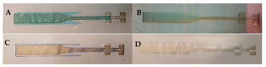 The screen-printed stretchable interconnects with different encapsulation materials. (A) Partially dielectric ink-coated, (B) entirely dielectric ink-coated, (C) partially thermoplastic polyurethane (TPU) heat-laminated, and (D) entirely TPU heat-laminated interconnect.