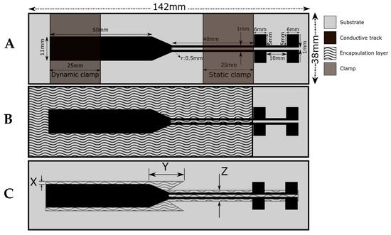 A schematic of stretchable interconnects. The dimensions of the substrate, conductive track and clamps are the same for all cases. (A) a non-encapsulated sample (Set 1). (B) An entirely encapsulated sample (Set 3 and Set 5) (except for the pads used for electrical characterization) corresponding to Figure 2B,D. (C) A partially encapsulated sample (Set 2 and Set 4) (X, Y, and Z are offsets) corresponding to Figure 2A,C.