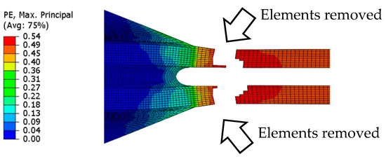 Figure 4 presents the area close to the connection where elements exceed the critical plastic strain. This area was removed for the visualization purposes. The same experimental conductive failure in the finite element model was reached when the critical plastic strain was 52.5%; this was used in our further analysis.
