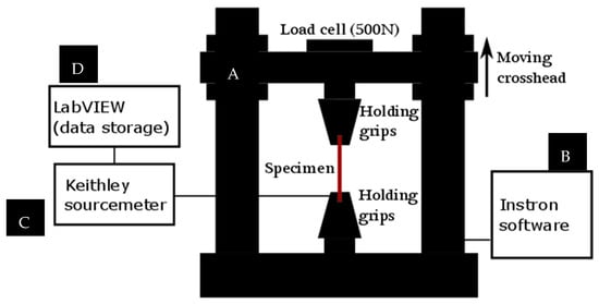 The schematic of the setup for electromechanical assessment. (A) The Instron 4411 Universal Testing Machine, (B) Instron software on a PC, (C) Keithley 2425 SourceMeter, and (D) LabVIEW software (version 2014, National Instruments, Austin, TX, USA) on a laptop.