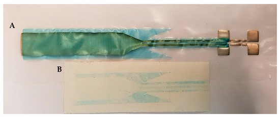 Peel test result. (A) The same sample after performing the peel test; (B) Tape used for the test. The blue trace indicates the poor adhesion between the substrate and the dielectric ink.