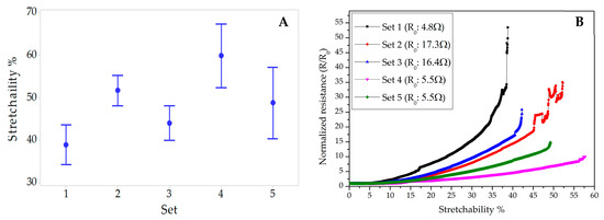 Figure 8A shows the interval plot of the stretchability of samples that were non-encapsulated (Set 1), partially (Set 2), and entirely (Set 3) dielectric ink-encapsulated, and partially (Set 4) and entirely (Set 5) TPU-encapsulated. Figure 8B shows a typical performance of each sample sets.