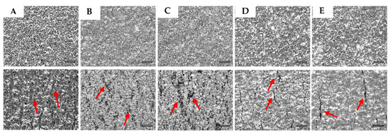 Optical microscope images of the transition area from all sets of samples (sets 1–5 are marked by A–E) when they are not stretched (upper images) and when they are stretched up to 60% (lower images). The scale bar in all images is 100 μm.