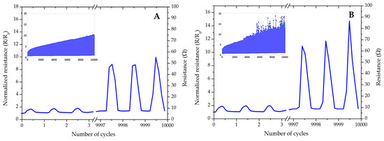 The normalized/normalized resistances during 10,000 cycles at 10% stretching. (A) Partially TPU-covered, R0: 5.4 Ω. (B) Entirely TPU-covered, R0: 6.1 Ω. The insets are the overall trend during all the cycles.