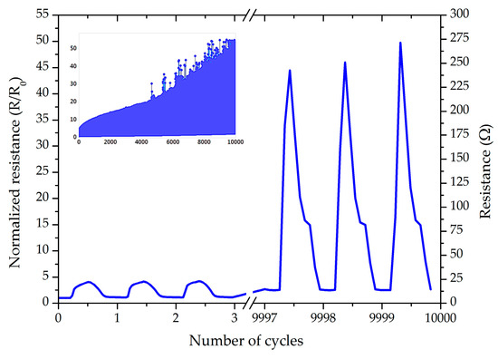 The endurance of interconnects during the cyclic test was investigated. We selected the samples encapsulated by the TPU layer due to their better reliabilities. Figure 10A,B show the three first and last cycles of the normalized/absolute resistances of the interconnects encapsulated, either partially or entirely by TPU, during 10,000 repetitive stretching–releasing cycles at 10% stretching. The inset images present the overall trend in changing of the resistances during all cycles.